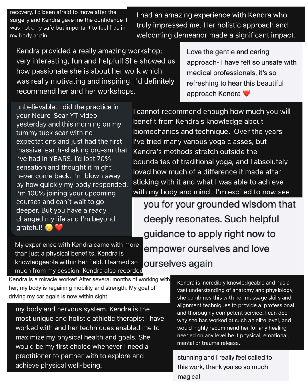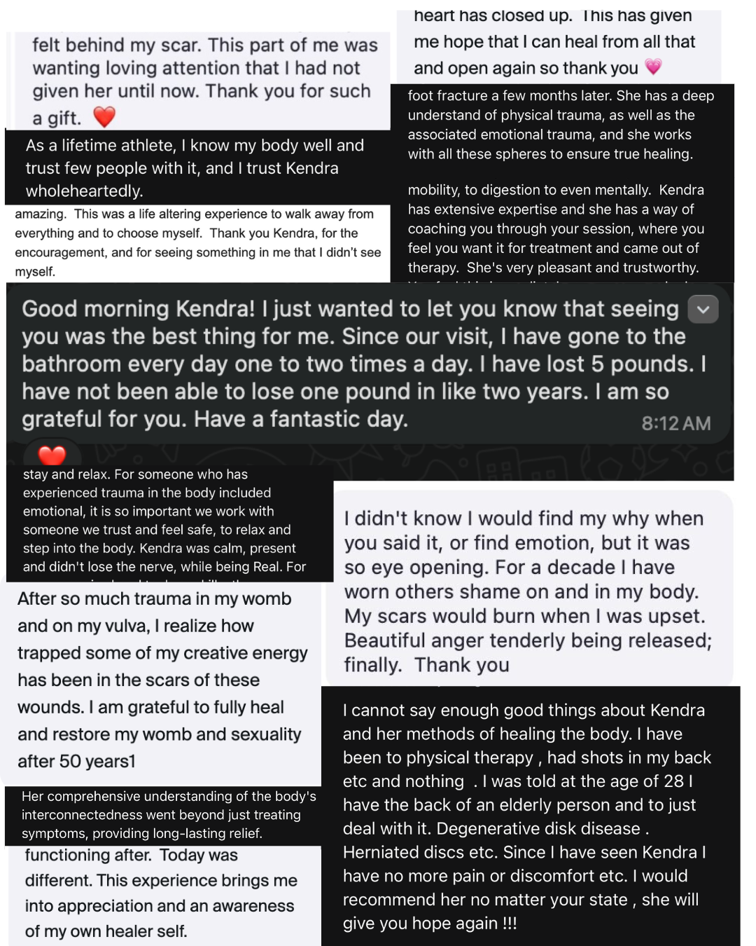 Before Kendra, I was afraid to start a healing process. I had put my trust in other healthcare providers and I felt let down. Kendra is a problem solver, has extensive knowledge of the body and her spirit is kind and gentle. I am so glad I went for it and dove in with her because it feels like she was speaking right to me and all of my problems. I felt totally held through the process and I learned so much along the way!Â